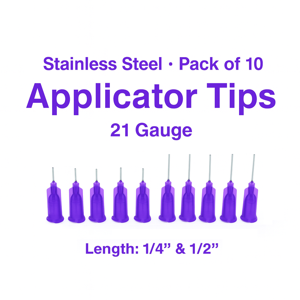 These 21-gauge stainless steel applicator tips are engineered for controlled flow and detailed work. While optimized for Jagua ink tattoo gel, they are also suitable for henna paste, craft paints, adhesives, and other liquid or gel-based materials used in fine drawing and design work. The tips are designed to fit securely into compatible bases or caps for stable, comfortable use.